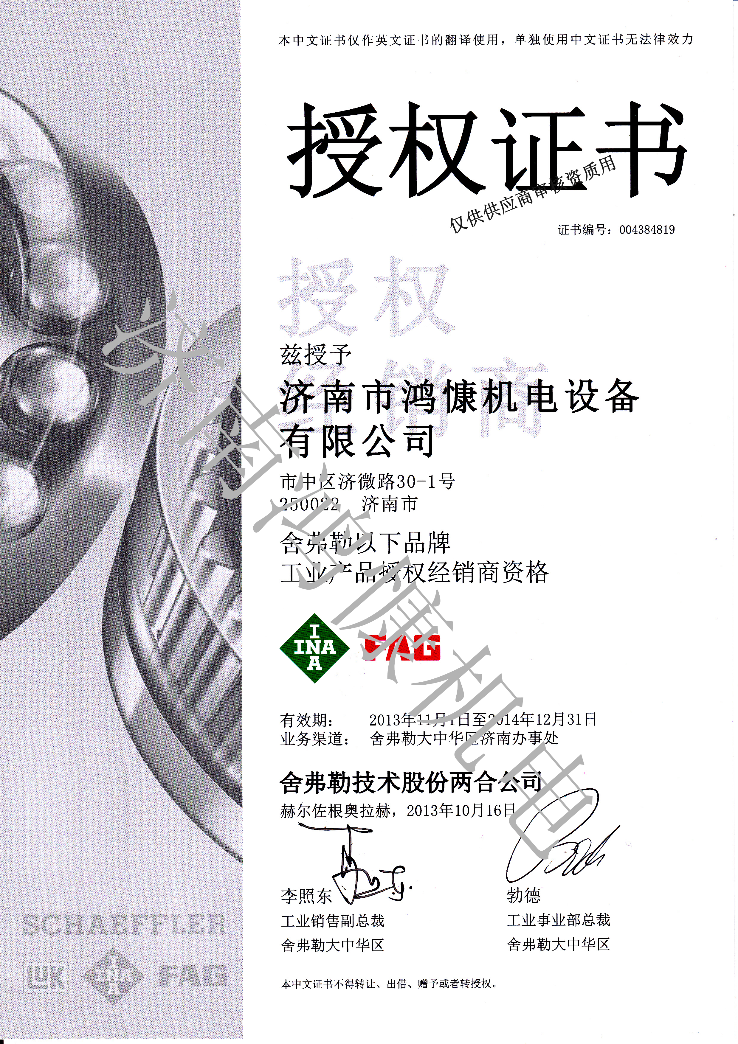 舍弗勒2014年經(jīng)銷商授權證書